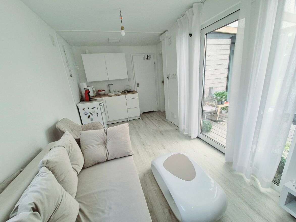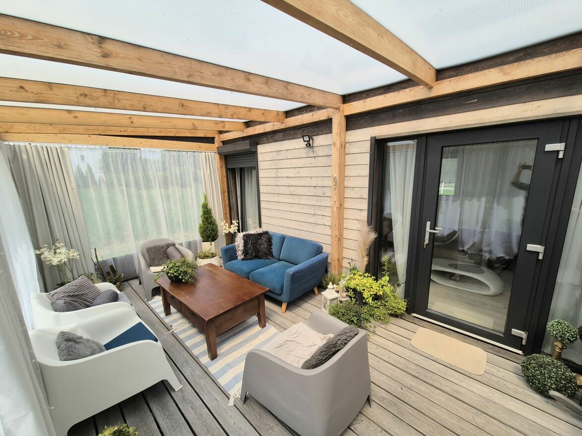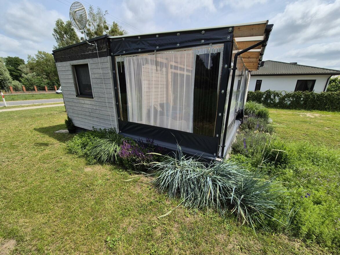 W skład domu wchodzi salon z aneksem kuchennym, 2 sypialnie i łazienka. Dodatkowo powierzchnia domu jest powiększona o obszerną werandę z zadaszeniem. Idealna na długie letnie wieczory.